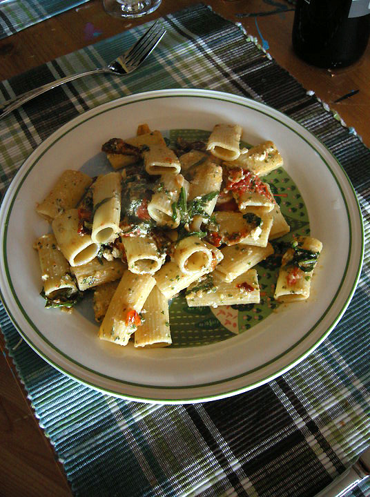 La semaine passée, j’ai fait une des meilleures recettes de pâtes. L’idée originale provenait du site SOS Cuisine: des pâtes à la roquette, aux mini-tomates et au féta. J’ai amélioré la recette en y ajoutant des oignons caramélisés et des tomates séchées légèrement réhydratées.