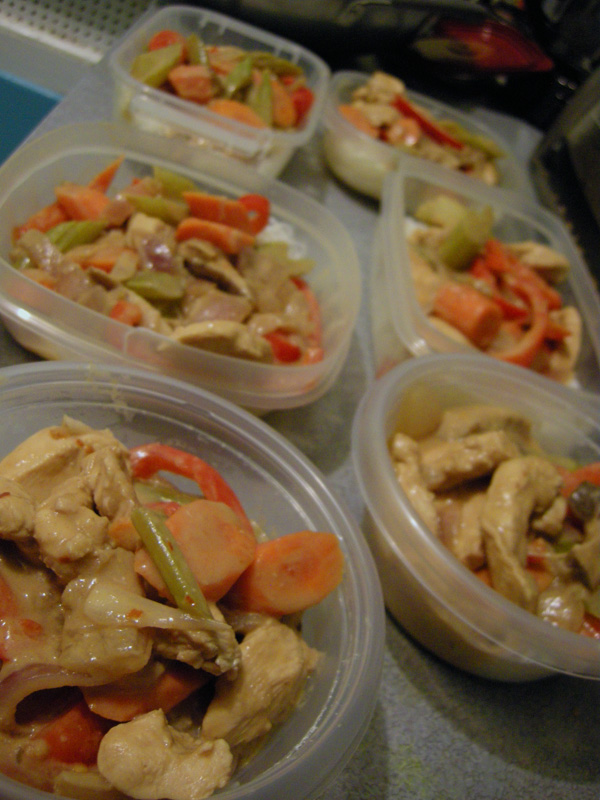 Pour ce qui est du contenu, ça dépend. Normalement, s’il s’agit de pâtes, il faut séparer les nouilles de la sauce (ce que je n’ai pas fait avec les vermicelles). Dans l’ensemble, je ne garde pas mes plats très longtemps (3-4 semaines) au congélateur. Ça me permet d’avoir un dîner différent par jour. Certaines recettes, comme le Chili con carne, nécessitent d’être plus réduites lors de la cuisson afin de compenser le surplus de liquide qui se produit avec la décongélation des légumes.