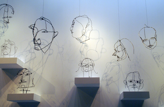 Calder a aussi fait dans le cirque à puce et dans les sculptures en fil de fer. L’une des plus célèbres est sans doute sa Josephine Baker. Mais ses sculptures en fil de fer présentent aussi plusieurs bustes de ses proches et amis. L’intérêt de ces oeuvres « vides » est l’impression de volume qu’elles créent par leur ombre portée sur le mur. Dans l’expo, on soulignait justement le problème que posaient ces oeuvres pour les photographes.