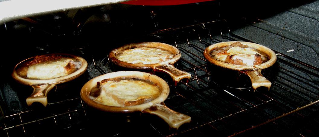 - Verser dans des plats qui vont au four. Déposer les croûtons et le fromage. Faire gratiner au four.