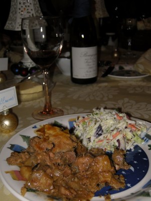 Dans la famille de ma mère, c’est la tourtière du Lac-St-Jean apportée par Claude, le conjoint de ma mère. Ce repas est désormais ancré dans la tradition de la famille de ma mère depuis quelques années. La préparation prend quelques jours et Claude fait tout. Il s’agit de loin d’un moment désormais attendu du temps des fêtes… un moment qui se prolonge pendant plusieurs jours grâce au Tupperware, au réfrigérateur et au micro-onde. Comme accompagnement, LA recette de salade de chou la meilleure, celle de Grand-maman Glo – du côté de mon père -, une recette que j’ai dans mon livre de recettes familiales.