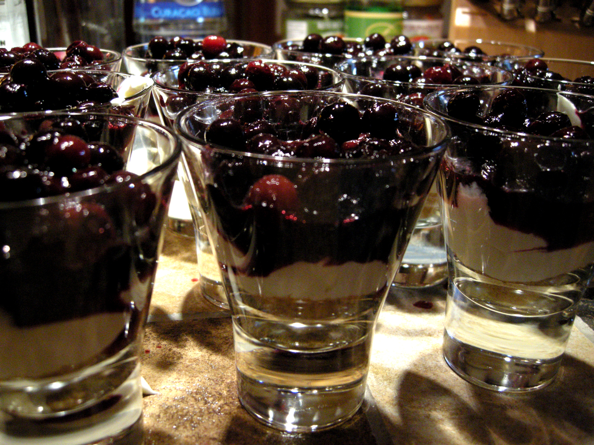 Comme dessert, j’ai préparé la recette de gâteau au fromage en verrine proposée par la Guilde culinaire. Pour le préparer, j’ai pris environ trois barquettes de bleuets que j’ai transformé en confiture mi-cuite (i.e. les bleuets sont suffisamment intacts pour rester croquant sous la dent.) Pour l’appareil au fromage, utiliser 2.5 briques de fromage à la crème.