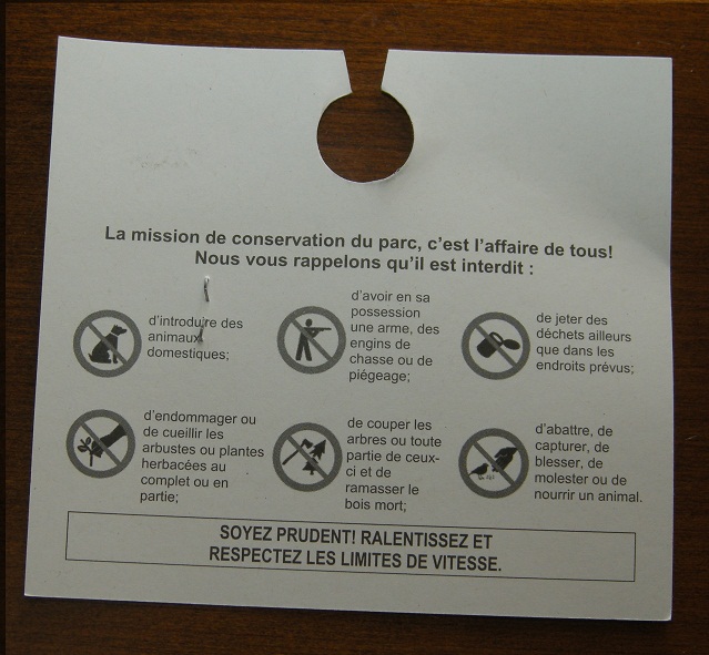 En lisant les règlement affichés à l’endos de ma passe de stationnement, je constate qu’il est interdit « d’introduire des animaux domestiques. » C’est quoi ce règlement ambigüe. En tous les cas, on se disait que si nous n,avons pas le droit d’introduire des animaux domestiques, introduire des animaux exotiques dans un SEPAQ serait fucking drôle. Imaginez, vous allez au bloc sanitaire – aux chiottes – et vous croisez une girafe ou un tigre du Bengale… ça c’est dépaysant. Et n’oubliez pas qu’il est formellement interdit de molester un animal!