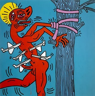Keith Haring, St-Sébastien (1984). Même stylisé, on reconnaît les repères iconographiques: flèches, poteau.