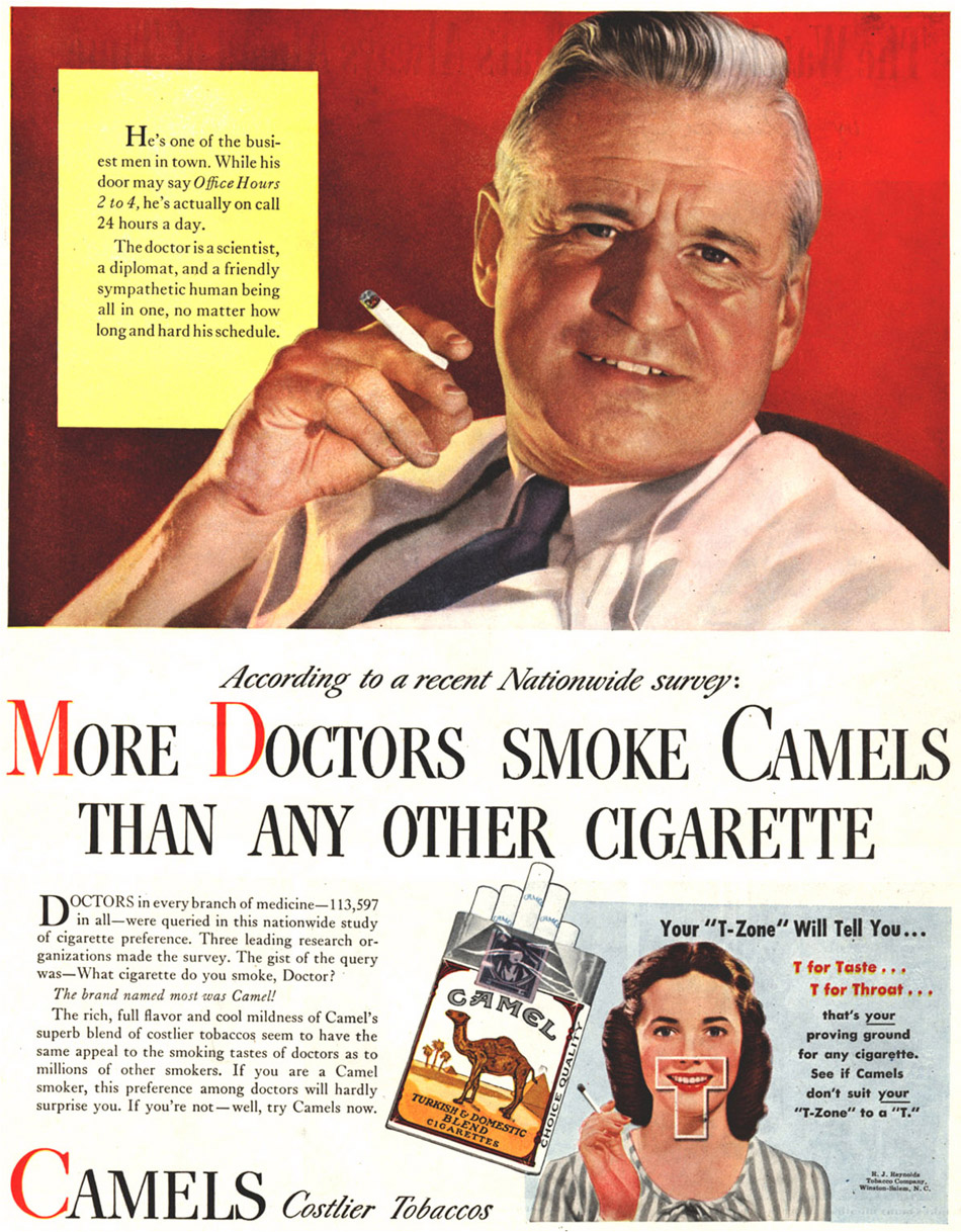 Les affiches de la salle de conférence du bureau de Nick Naylor – jeu de mots… nail… cela dit, ils leur clouent le bec pour vrai! – existent vraiment. J’en ai déjà parlé il y a un an, mais ça reste surprenant de voir comment l’industrie du tabac se servait du discours médical et la caution d’acteurs connus pour faire la promotion de leurs produits. Pour plus d’affiches, vous pouvez consulter le site de l’Université Stanford.