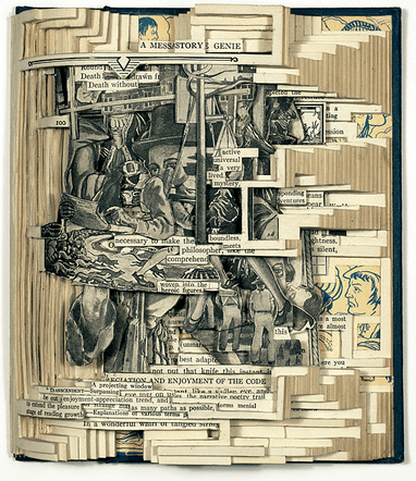 Pour sa part, Brian Dettmer recourt aux images des livres afin de les mettre en scène ou, plutôt, les encadrer à l’intérieur des livres évidés de leur contenu.