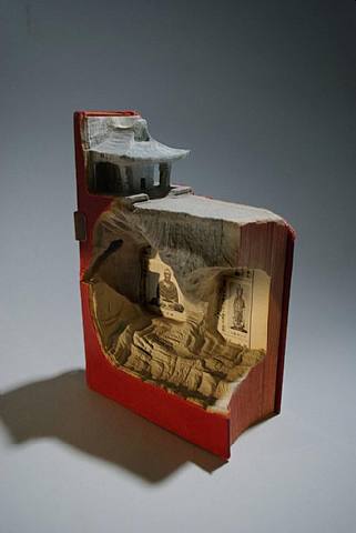 Le dernier artiste qui sculpte à partir de bouquins est le québécois Guy Laramée. Ce dernier utilise les livres comme s’il s’agissait d’un bloc de granite. En sablant les livres, il reproduit des scènes généralement inspirée de paysage orientaux ou de scène de temple. Dans son cas, ni les images, ni les mots du livre sont mis en valeur.