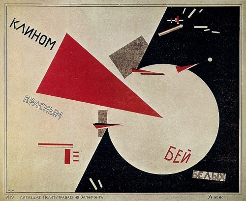 El Lissitzky, Beat the Whites with the Red Wedge (1919). Cet artiste, un suprématiste, versé aussi dans la propagande. On remarquera le langage abstrait toléré par les communistes contrairement aux nazis.