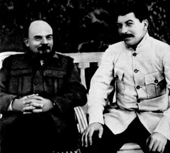 Lénine et Staline lors d'une rencontre à Gorki en 1922.Cette rencontre n'a probablement jamais eut lieu puisqu'il s'agit d'un photomontage.