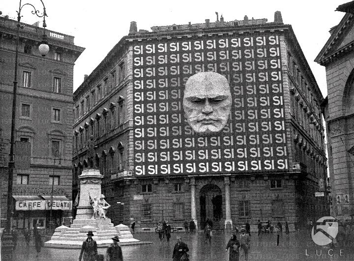 Mussolini en propagande au Palazzo Branschi, Rome (1934). Vous constaterez que le seul message tient au visage du Duce avec l'inscription "Oui". Un bigbrotheresque.