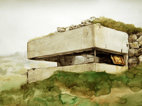 Le bunker, de par sa nature, est quasi indestructible ce qui nous permet d’en saisir les traces plus d’un demi-siècle après sa construction et les assauts subis. Deux artistes les mettent en valeur et je suis tombé sur leurs oeuvres récemment. Il s’agit du photographe Jonathan Andrew et du peintre Michael Hall.